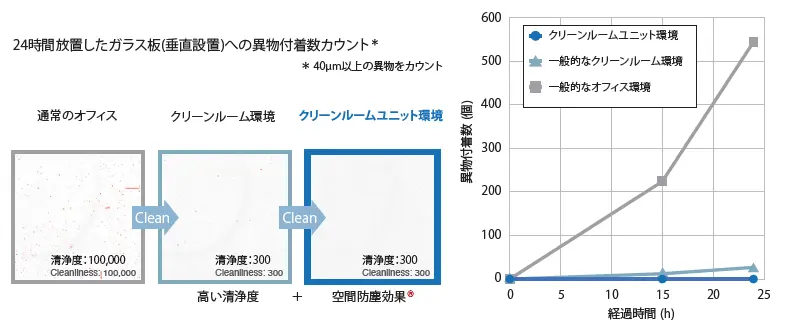 空間除電Ⓡをしているため、内部で発生する異物があっても付着しません。 同清浄度のクリーンルームと比較しても そこからさらに実効的な異物付着が1/10*に削減可能です。 ![]() (*周囲の環境等により変動) |