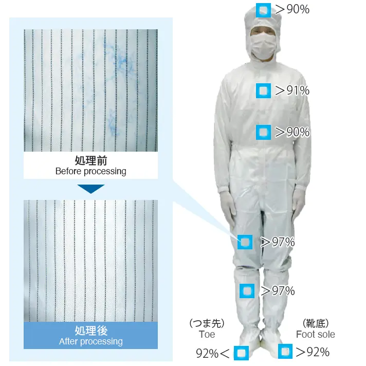 頭の先から靴底まで、濃密イオンエアブローで付着異物を除去・回収できます。 ![]() *所定のホコリサンプル、測定条件での社内評価で得られたデータであり、保証値ではありません。 |