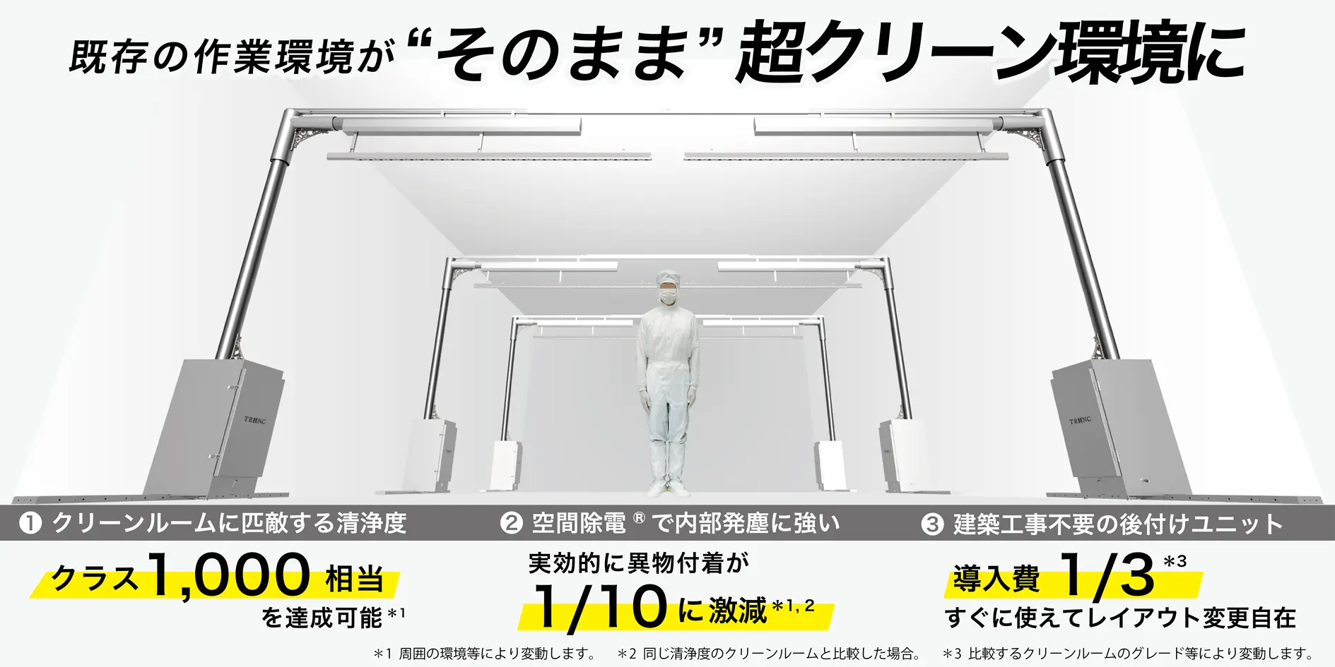 TRINCクリーンルームユニットは、普通の部屋に設置するだけで部屋の清浄度を上げる製品です。 既存の工程を、工場の稼働を止めずに即日クリーンルームに匹敵する環境に変えます。 クリーンルームとは異なり、工場の建築・建物の改造は不要。 室内圧を上げる必要も、部屋自身の機密性も不要です。 |