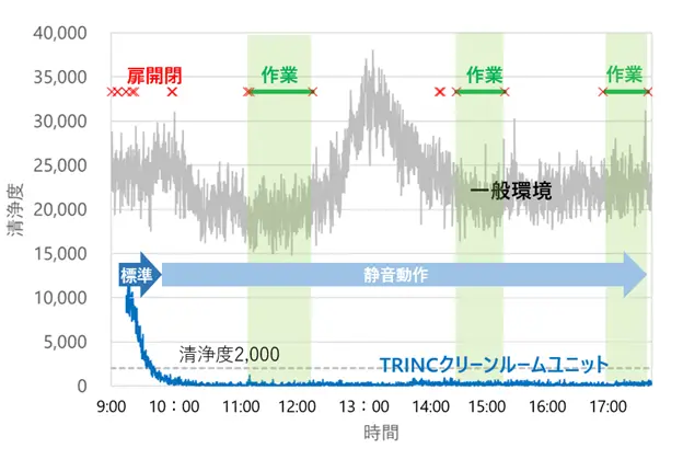 TRINCクリーンルームユニットは高清浄度(クラス1,000*程度)を維持します。 6 x 7mの一般の部屋に設置 ![]() (*周囲の環境等により変動) |